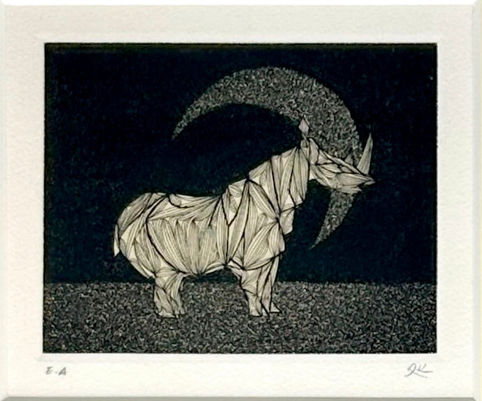 加山又造の版画の中で、猫や桜に比べると「サイ」はよりストイックで芸術性の強いモチーフとして、アートファンやコレクターから高く評価されています。特にこの1978年のエッチング作品は、その密度の高い表現から現在も市場で人気があります。